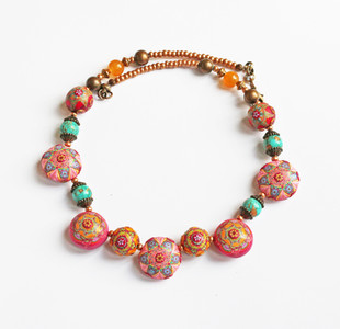 Unlike some other artists who use kaleidoscope veneers to laminate various objects or create decorations, Patricia creates stunning necklaces, in which she skilfuly combines her kaleidoscope designs and other kinds of beads, often vintage. Her jewellery reveals inspiration by other colourful cultures, such as Indian, African or Eastern European.