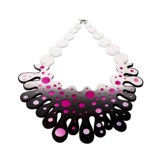 A polymer clay artist from Iran, Shila Habibian is known for her emotional depth, bold forms, and imaginative use of color. She discovered polymer clay five years ago during a stop-motion class and has since built her creative world despite limited access to materials and cultural restrictions. With a background in painting, sculpture, and graphic design, she brings a refined visual language to her work, while her photography and styling give her jewelry a distinct fashion-forward identity.